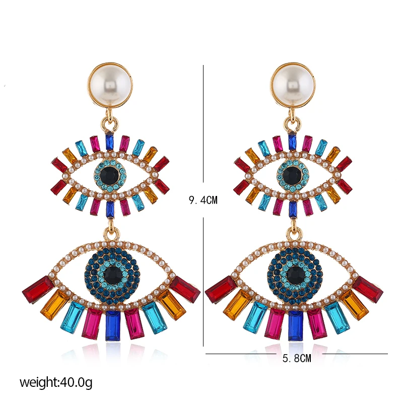 Metals Type: Zinc AlloyStyle: VintageShape\pattern: GeometricMaterial: MetalGender: WomenSize: 9.4cm*5.8cmWeight: 40gCapability: High Quality, Low Price, Large Stock, Fast ShippingOccasion: Anniversary Engagement Gift Party WeddingFeature: Crystal Evil Eye Dangle Earrings