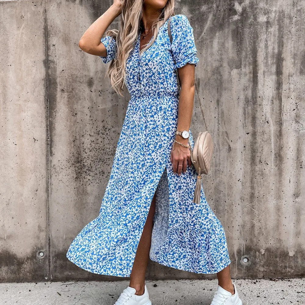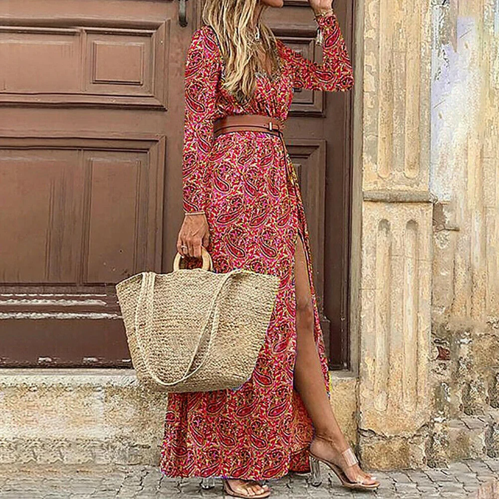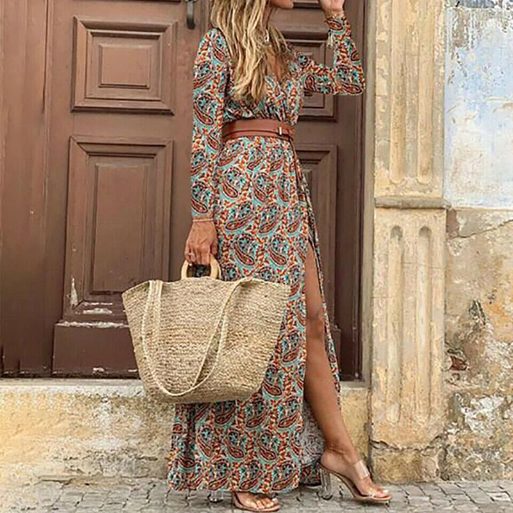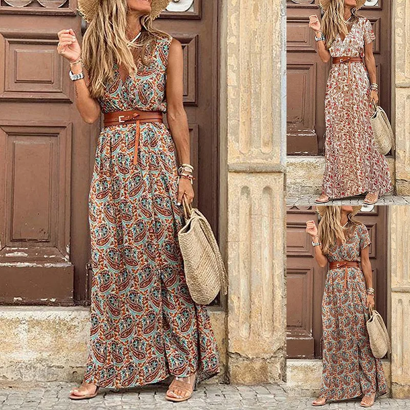 Season: Spring / Autumn Neckline: V-Neck Sleeve Style: Regular Decoration: Sashes Style: Bohemian Dresses Length: Floor-Length Material: Polyester Gender: Women